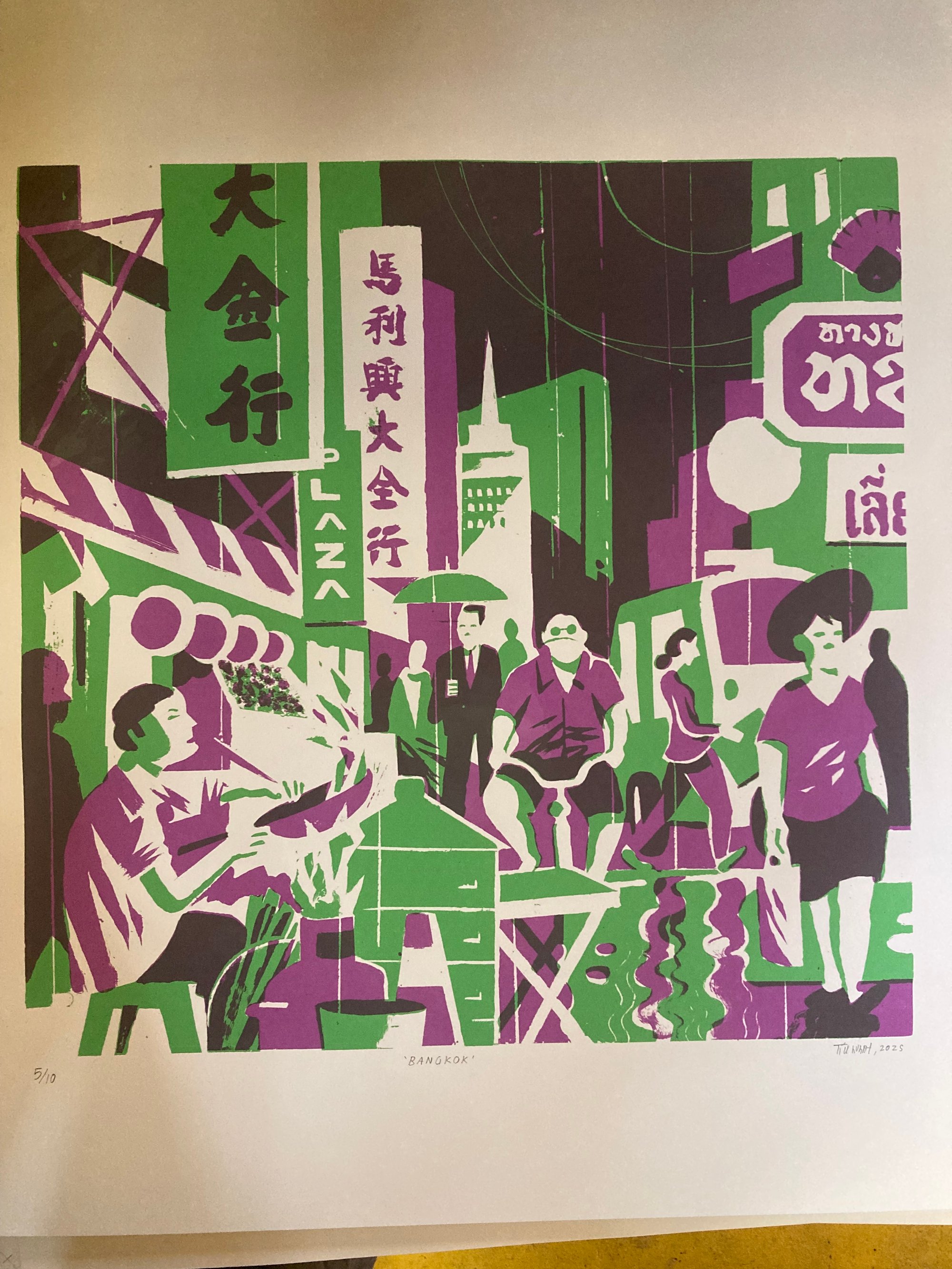 Artwork painted on two sheets of glass at the studio and printed by hand in two colours.